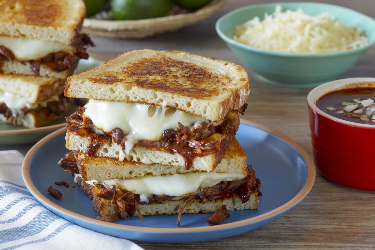 - Slice each sandwich in half and serve with a small bowl of heated birria consommé garnished with chopped onion and cilantro. Be sure to dip each bite of the sandwich in the warm, rich consommé!
