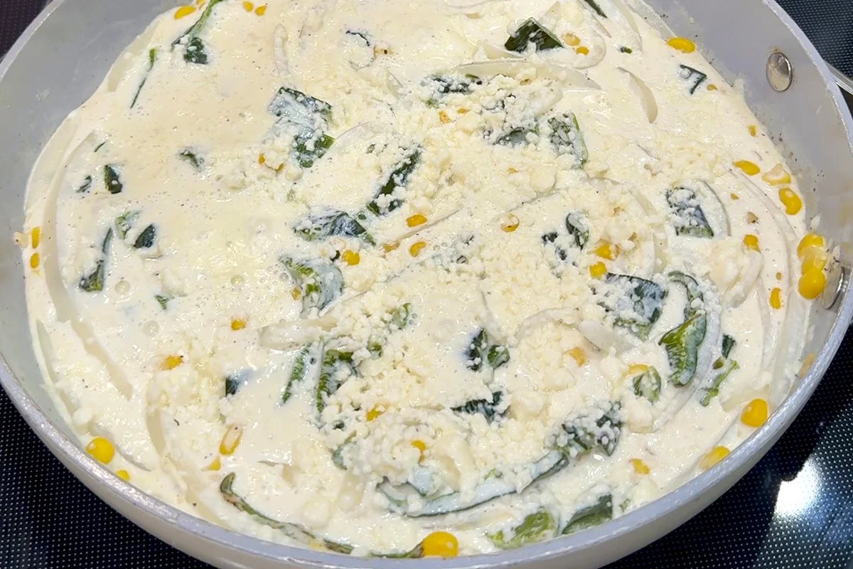 - Add sliced poblanos and corn. Cook 3-4 minutes.